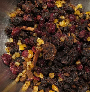 I’ve made this because we have a party planned – once the spicy boozy fruit is strained out I will turn it into some sort of tart for us to eat, alongside brownies or a chocolate cake, with shots of the Christmas vodka.